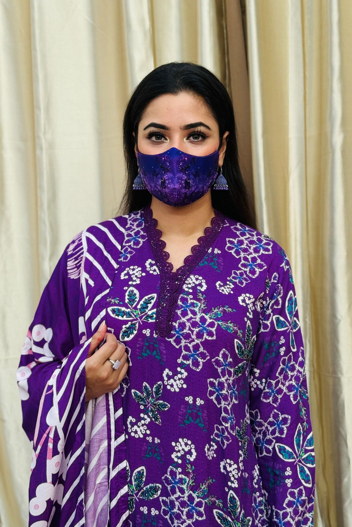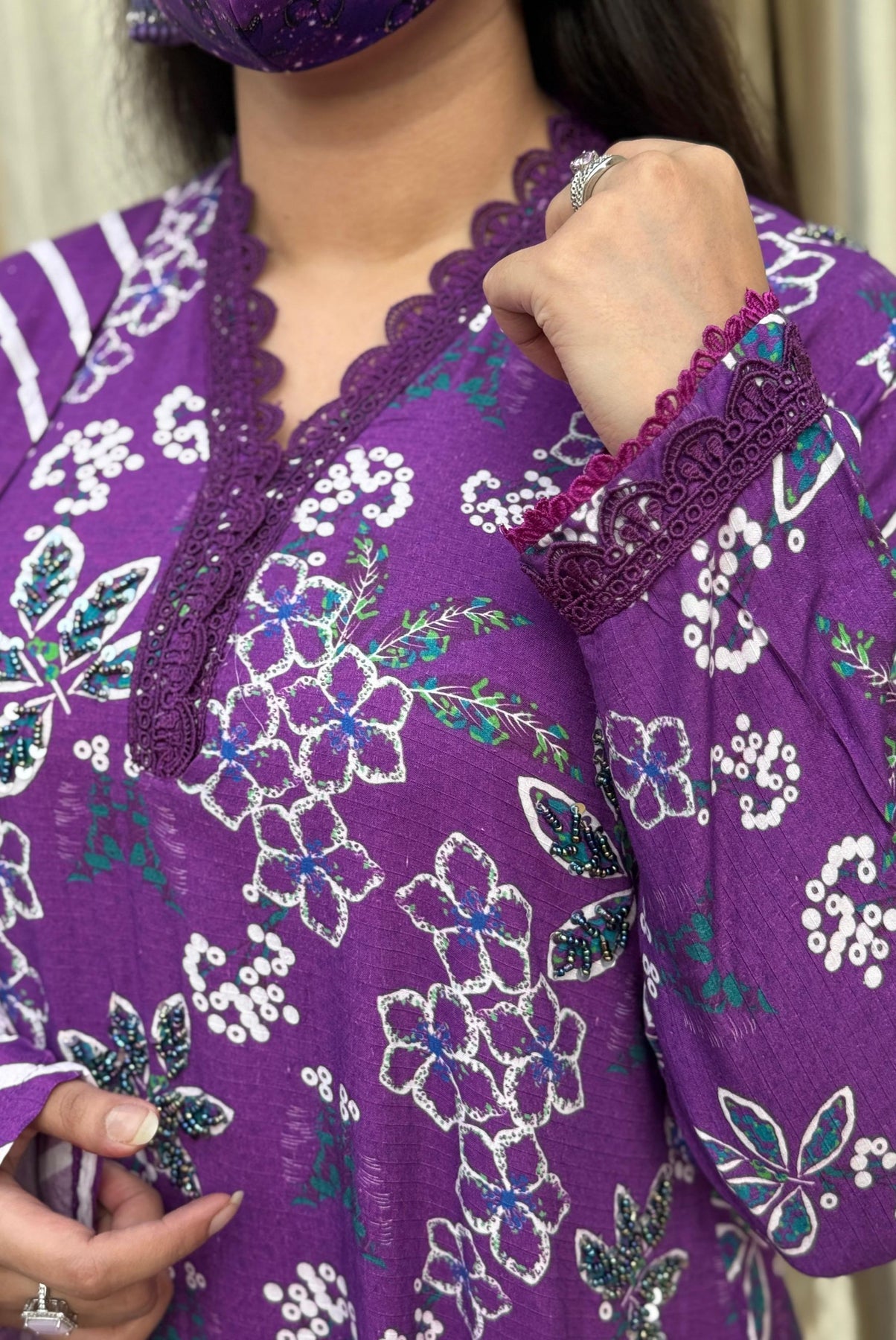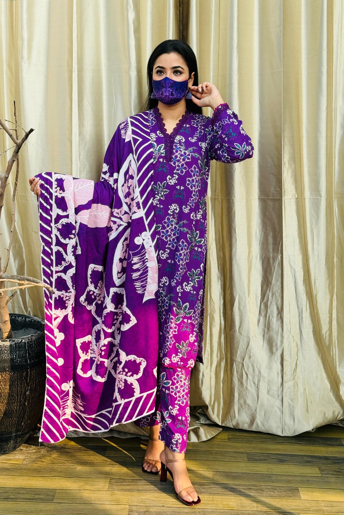 An Embroidered Shirt With Decoorus Embroidery On Necklin,Sleeves And Border Is Paired Up With Trouser And Dupatta Which Is A Perfect Match For This Winter