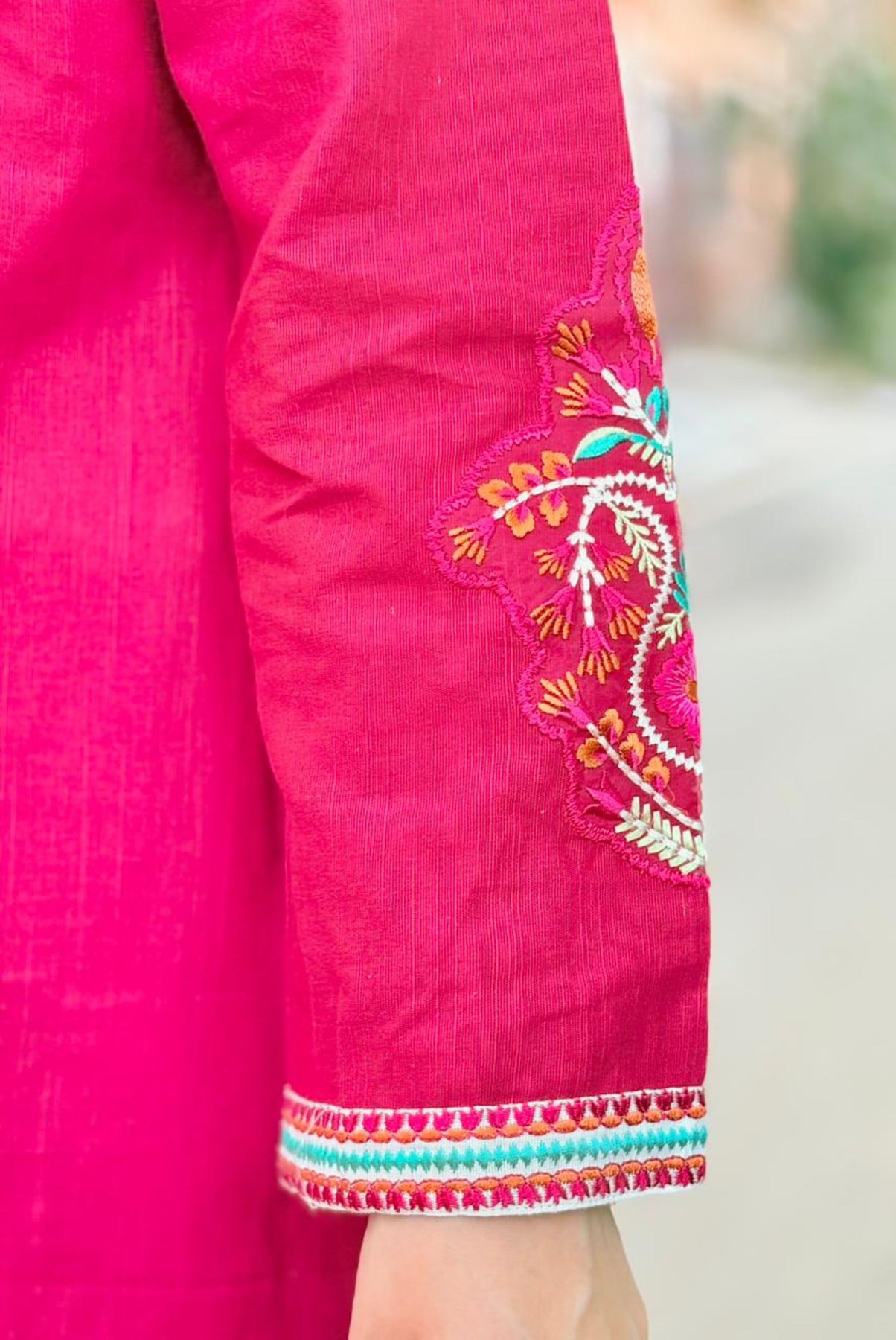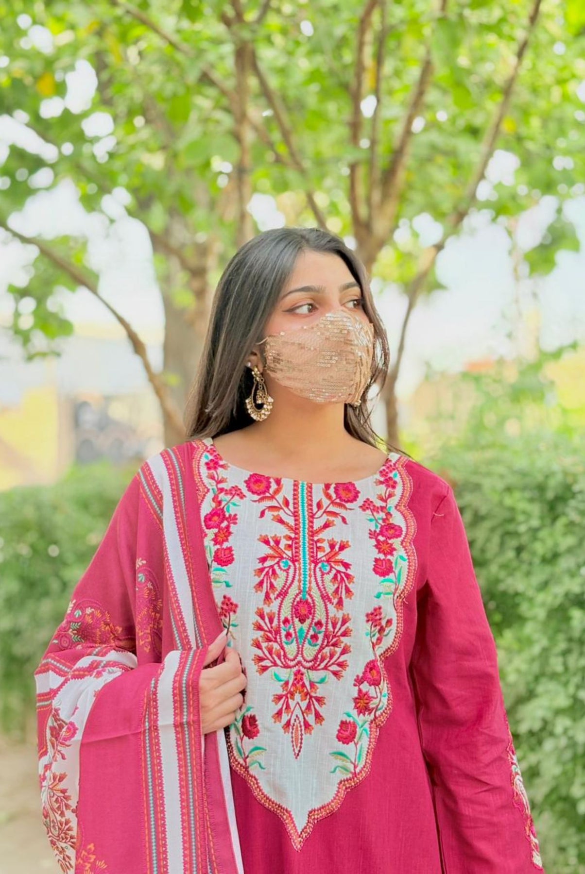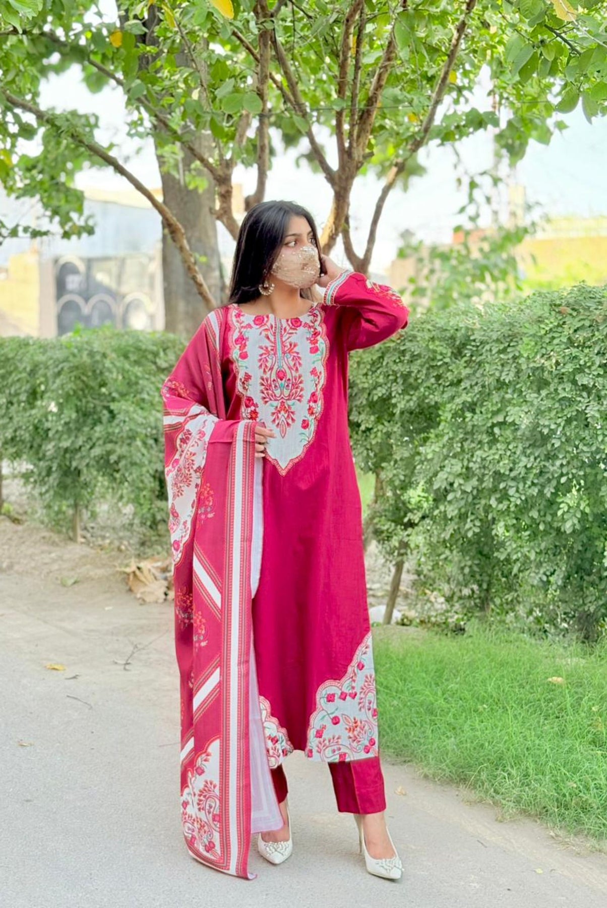 An Embroidered Shirt With Decorous Embroidery On Neckline,Sleeves And Border Is Paired Up WIth Trouser And Dupatta Which Is A Perfect Match For Any Occasion