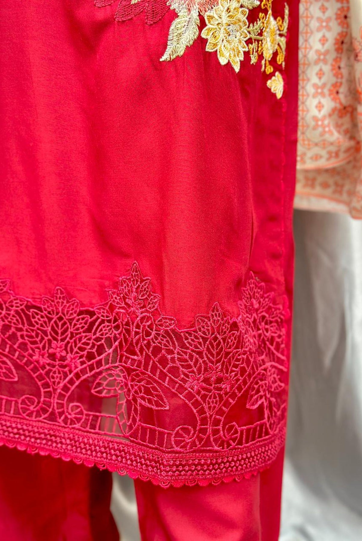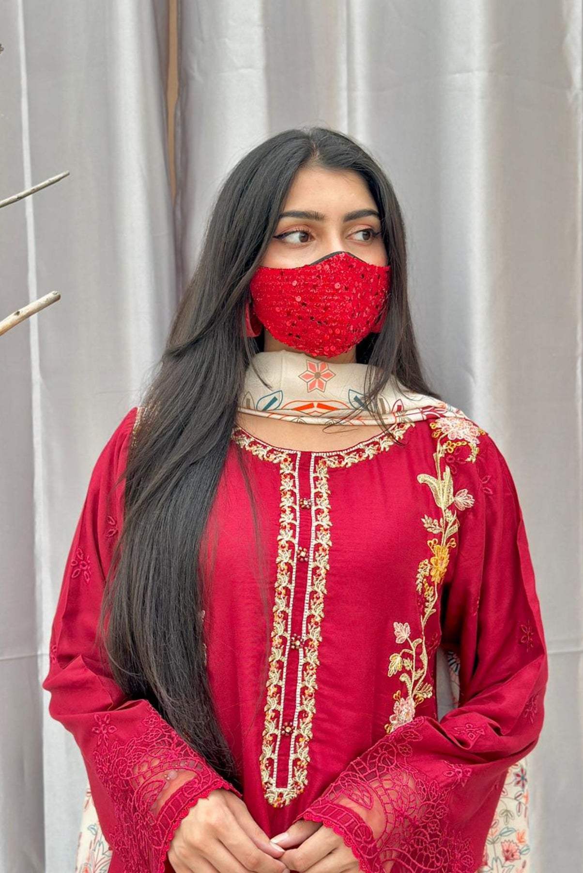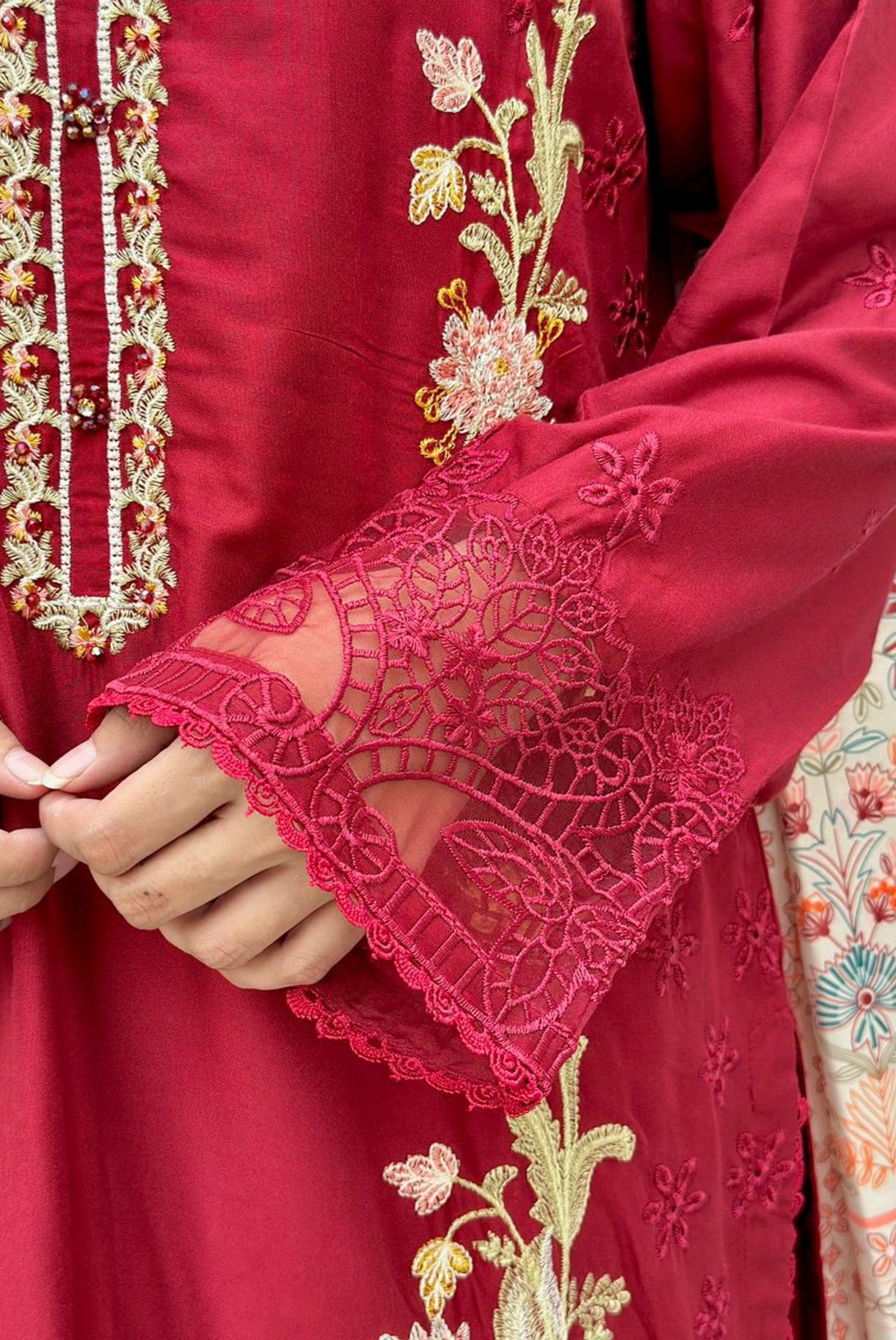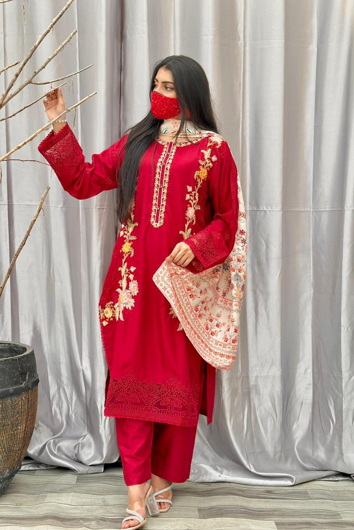 A Luxury Linen Dress With Decororus Fully Embroidered Shirt Is Paired Up With Embroidered Trouser And Marina Shawl Which Is A Perfect Match For Any Occassion