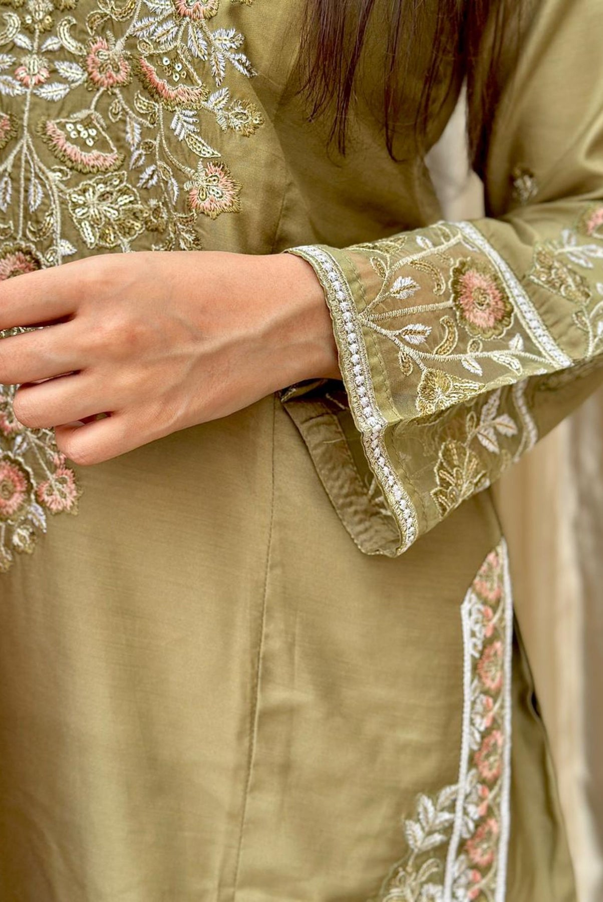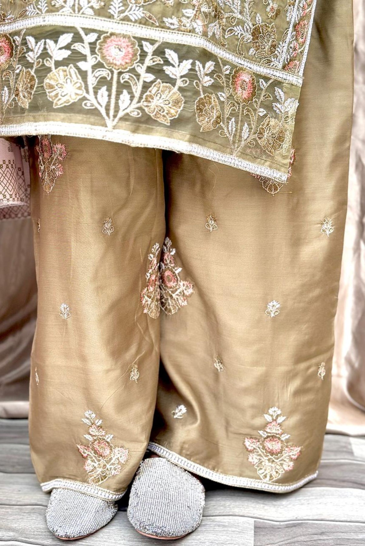 A Stylish Embroidered Viscose Shirt With Decorous Sequin Embroidery On Neckline, Sleeves And Border Is Paired Up With Sequin Embroidered Trouser And Marina Shawl Is A Perfect Match For Any Occassion