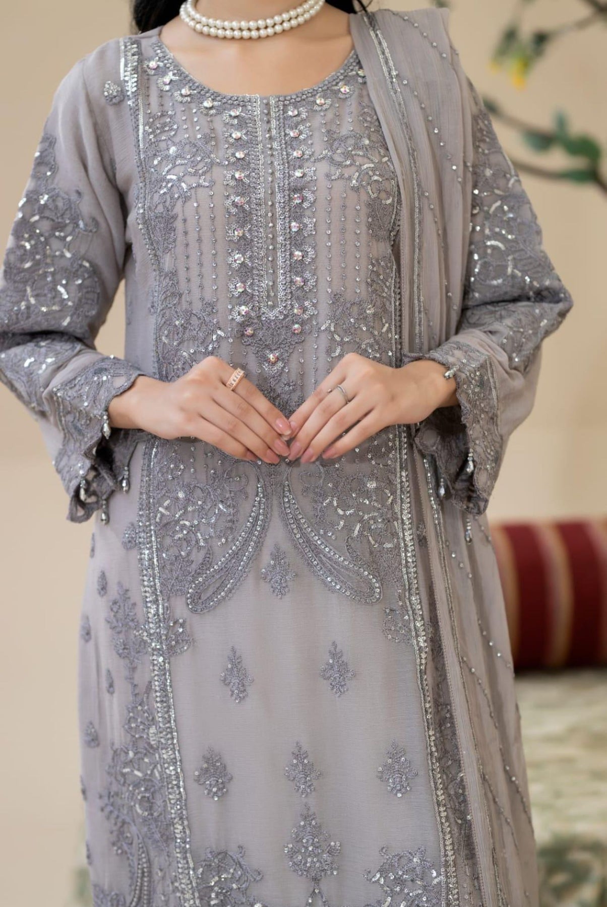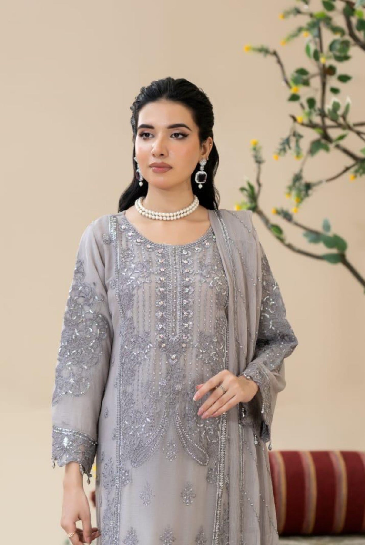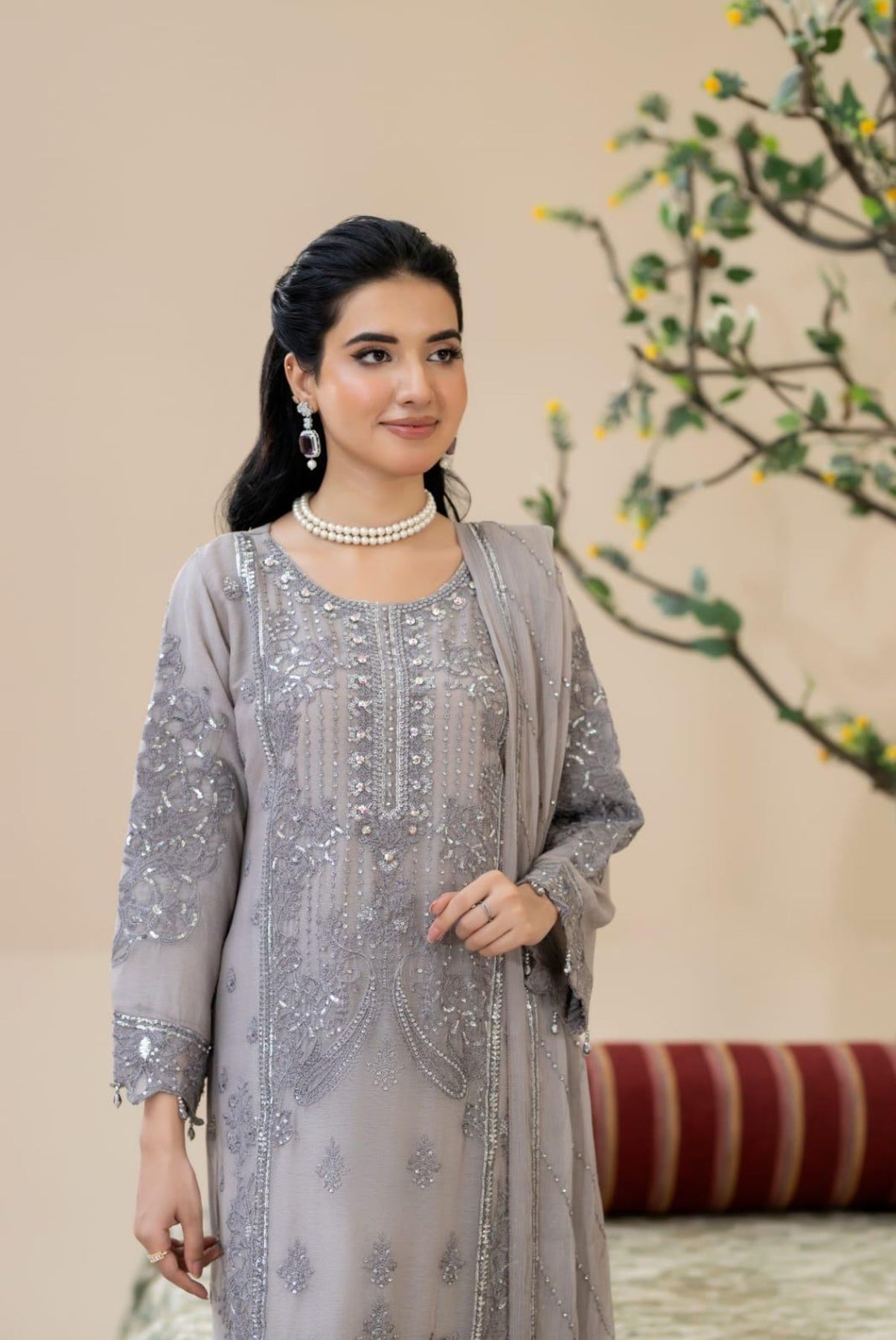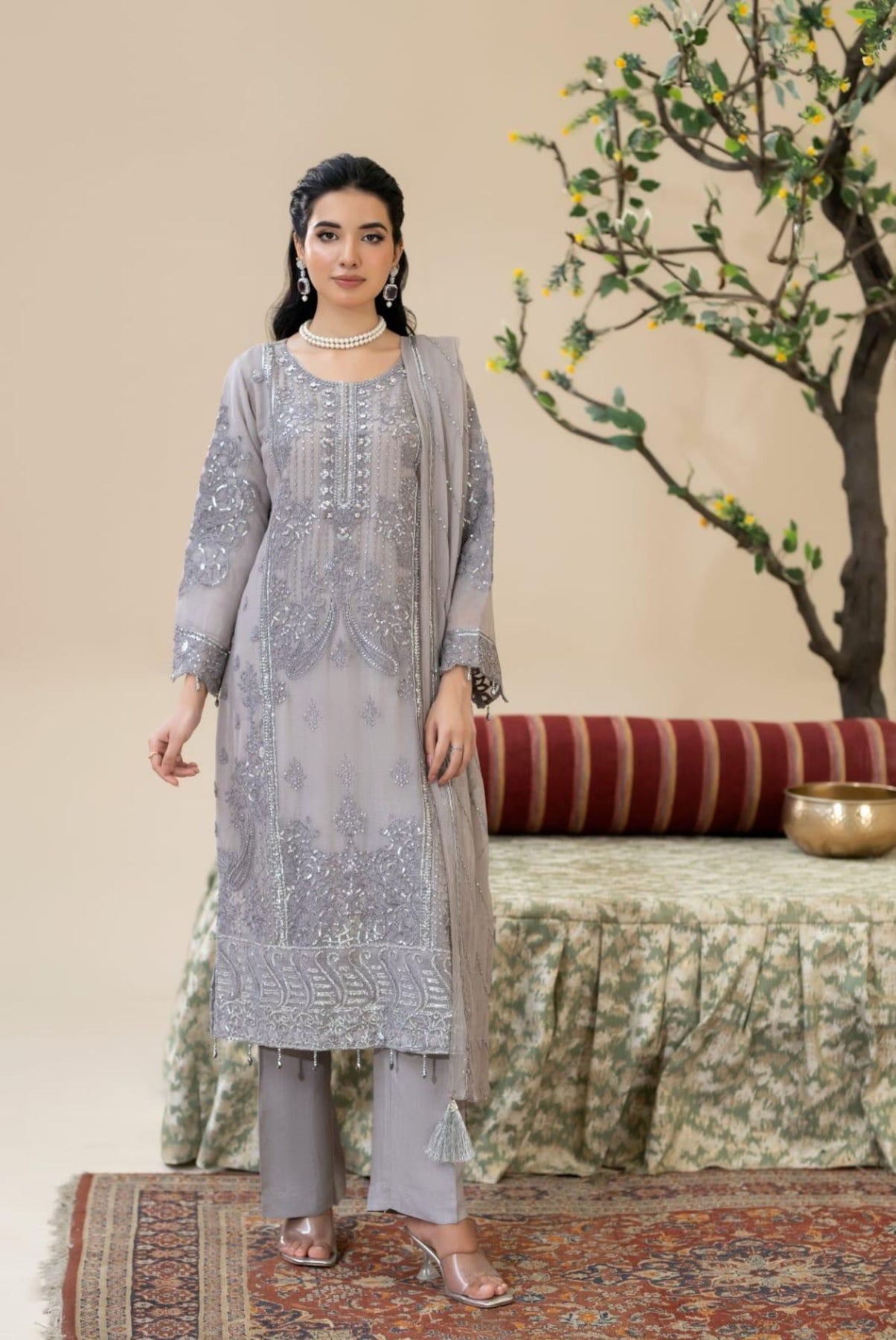 A Stylish Embroidered Shirt With Decorous Embroidery On Neckline, Sleeves And Border Is Paired Up With Trouser And Dupatta Which Is A Perfect Match For Any Occasion