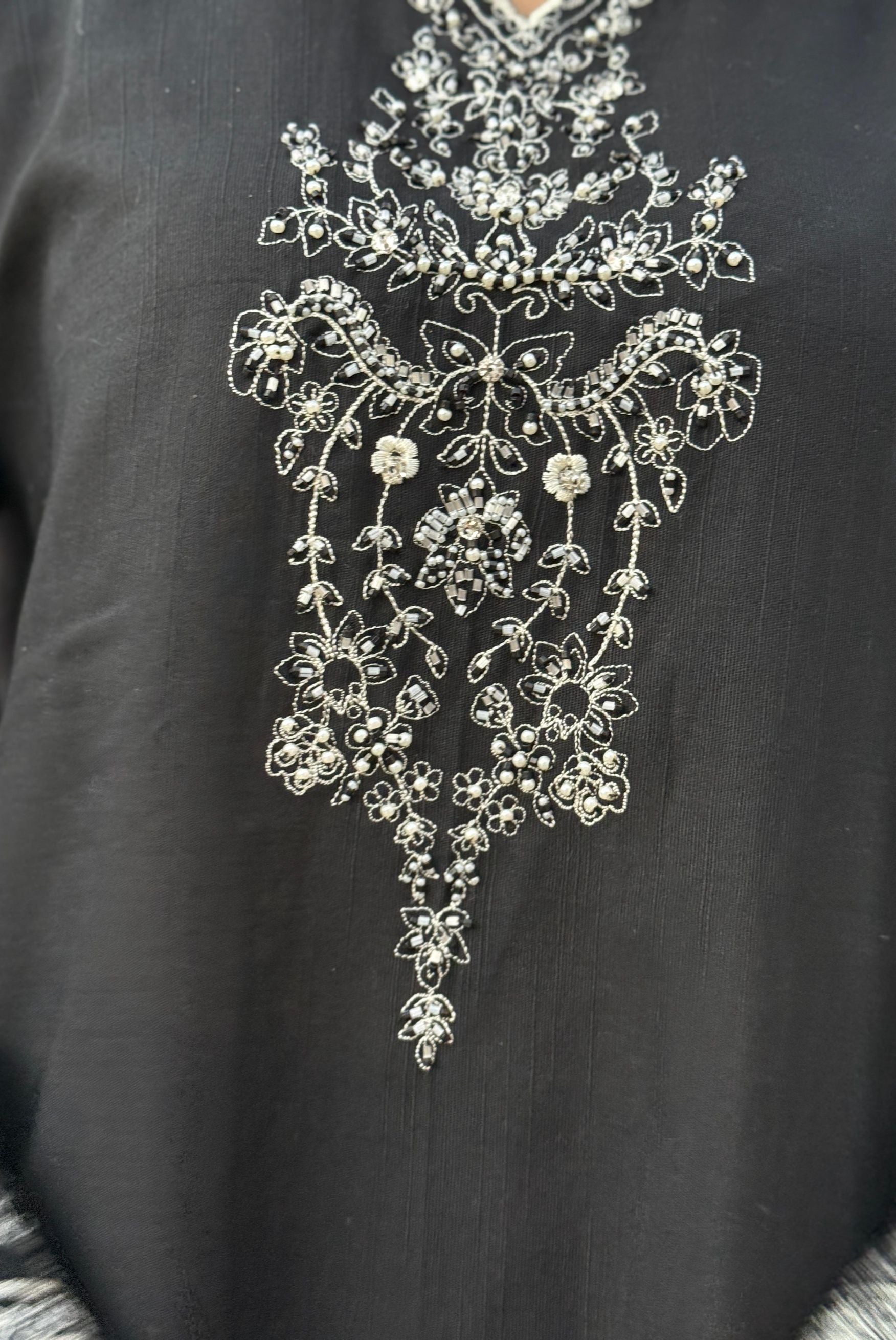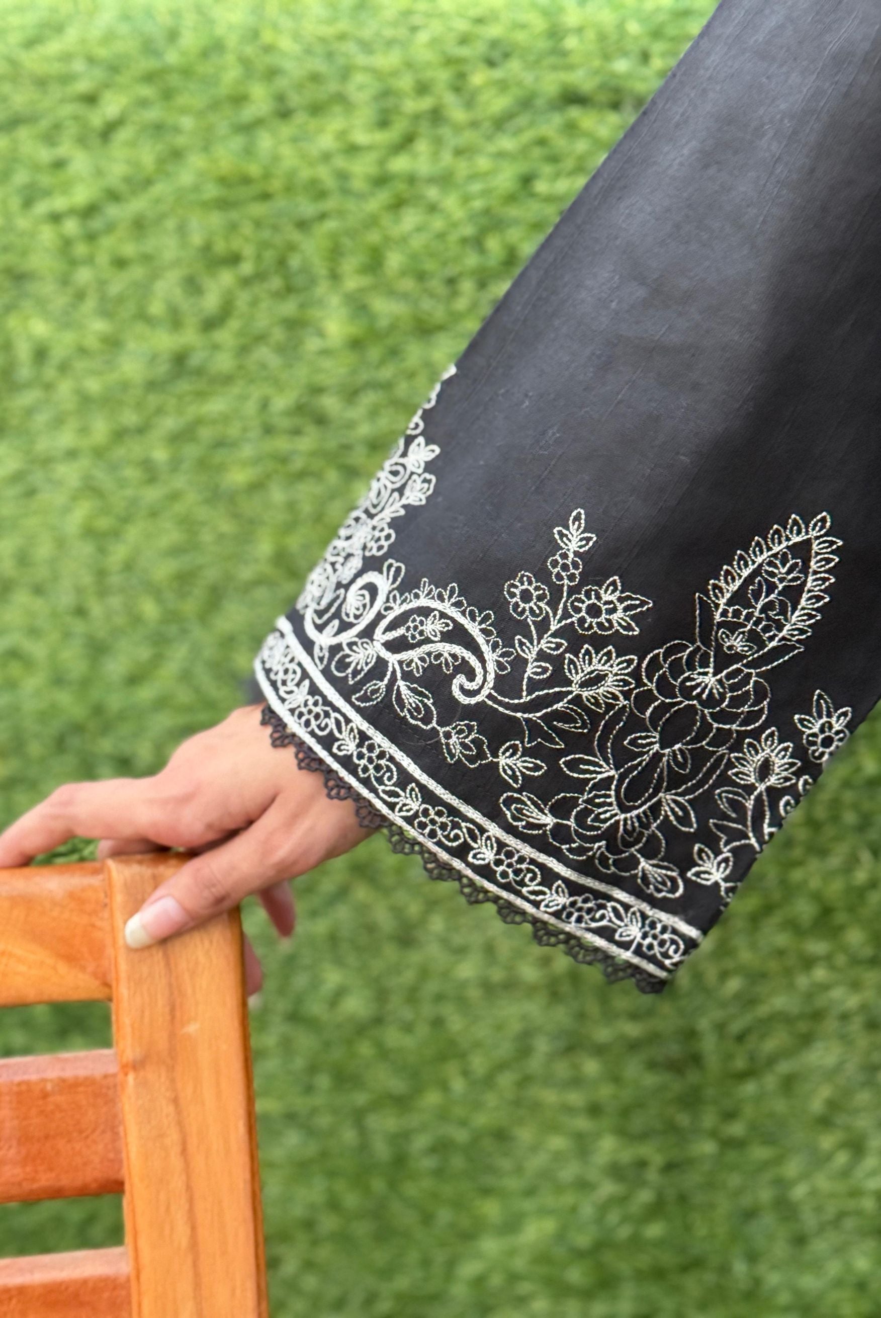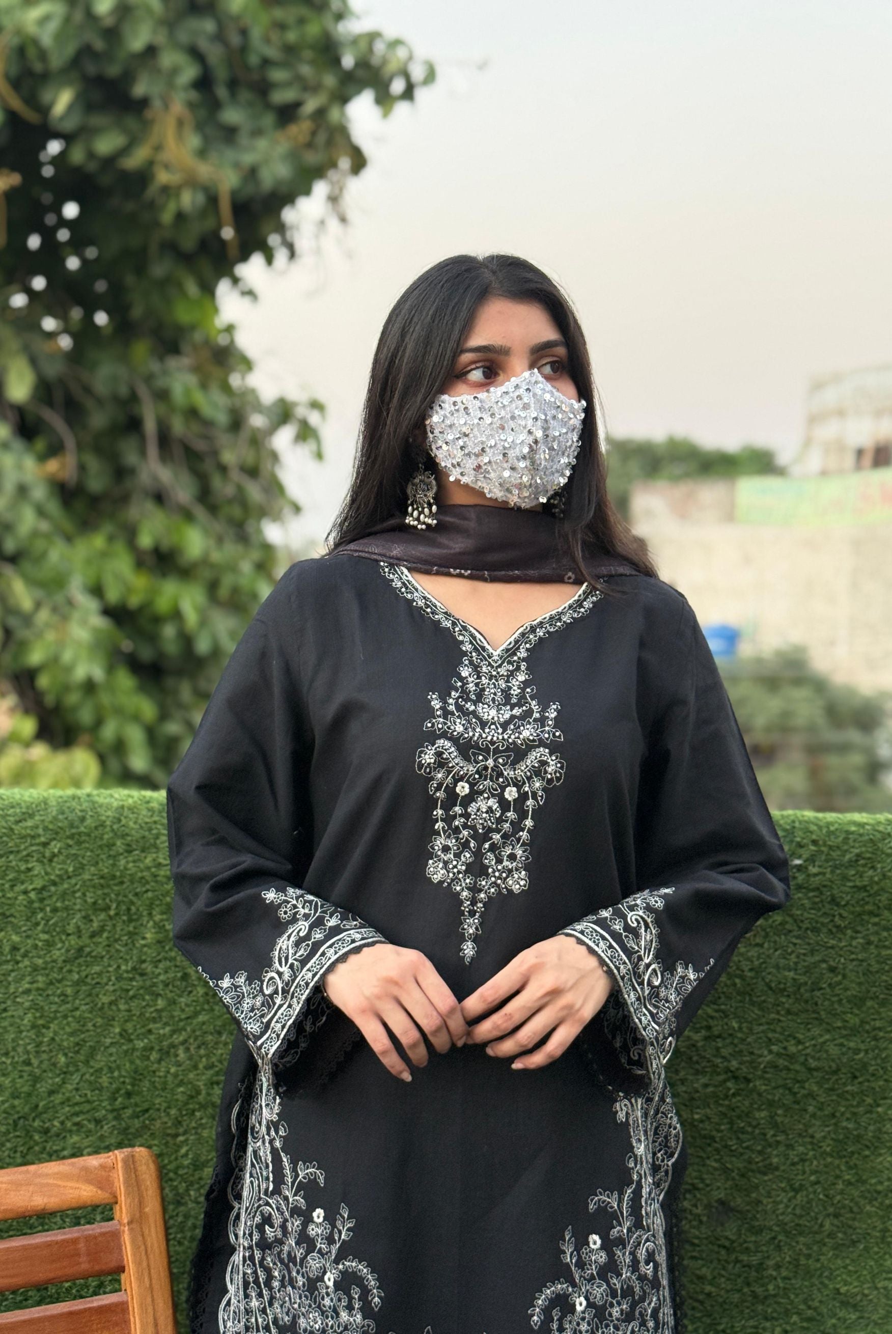 An Embroidered Khaddar Shirt With Decorous Embroidery On Neckline,Sleeves And Border Is Paired Up With Trouser And Dupatta Which Is A Perfect Match For Any Occasion