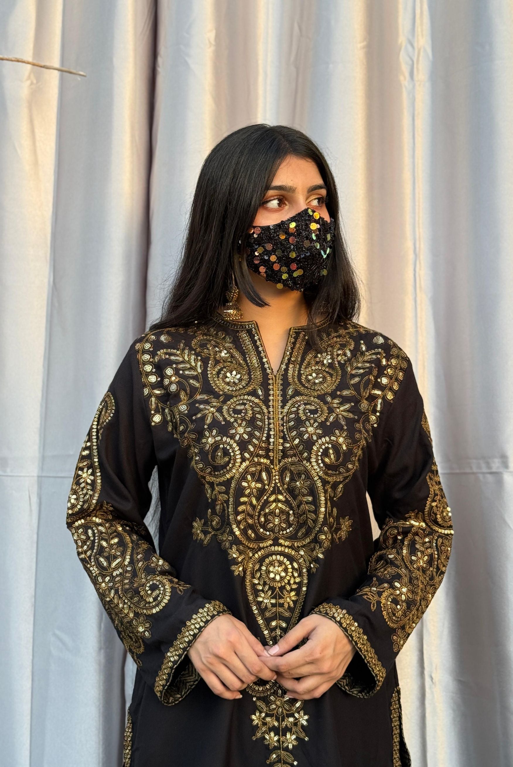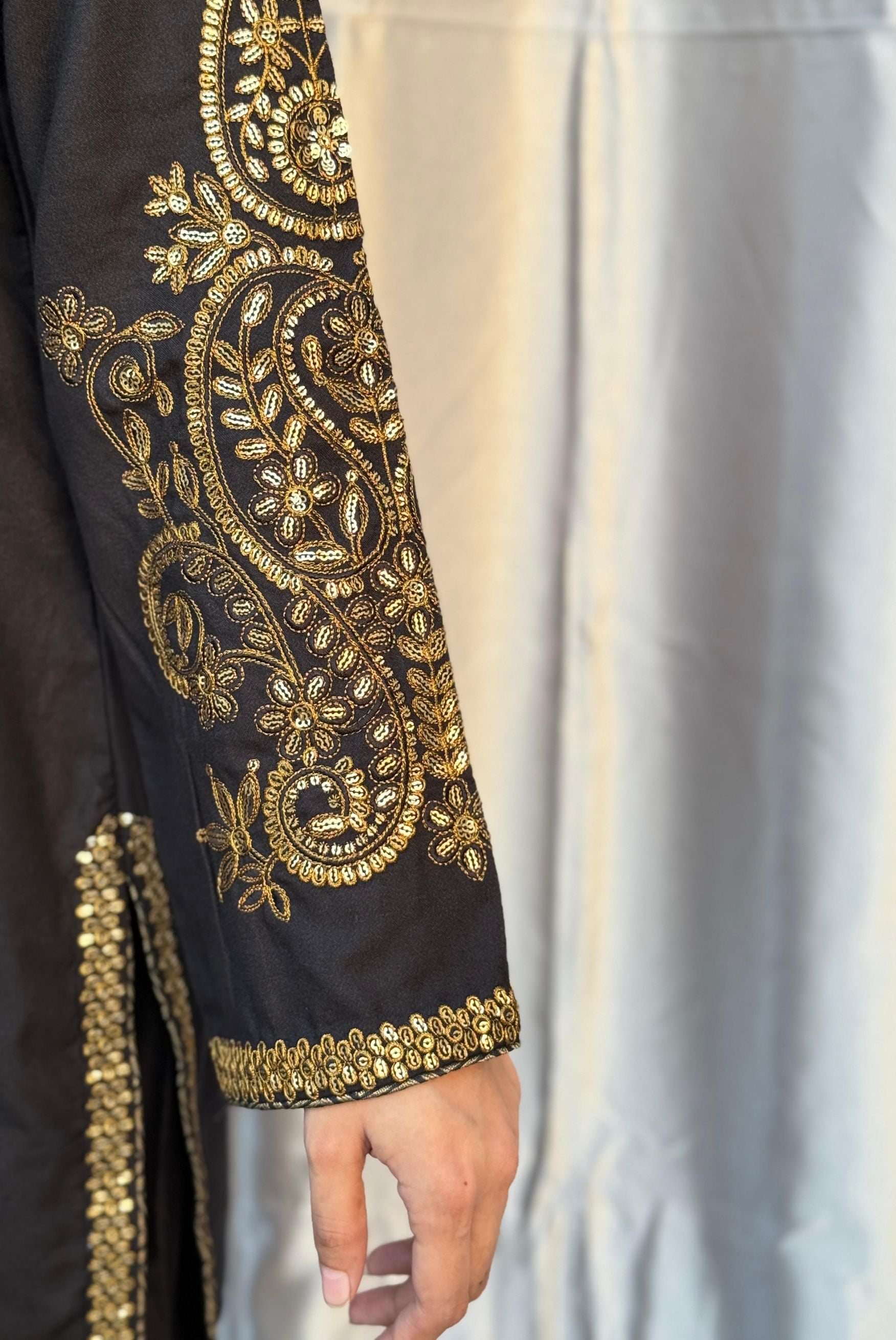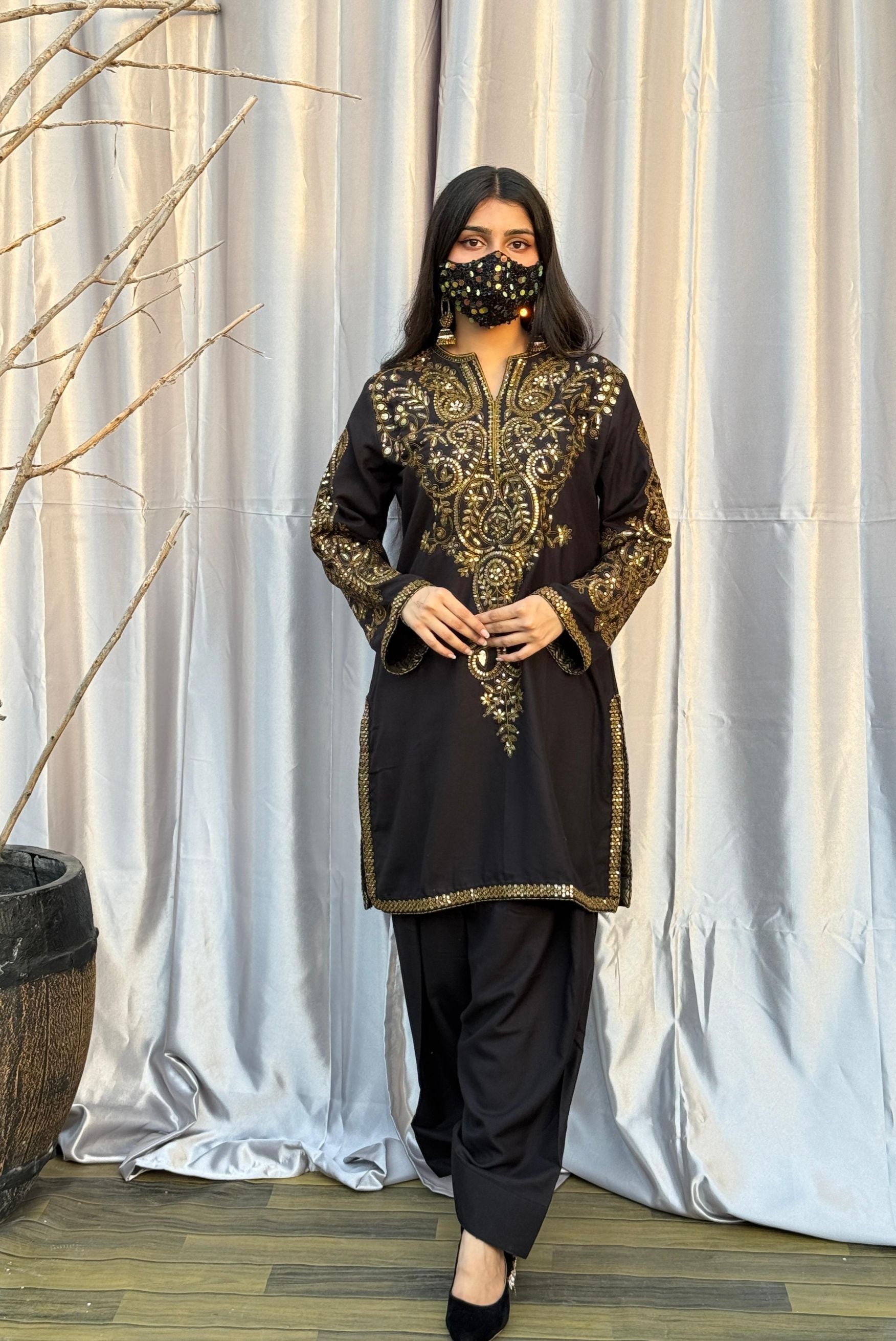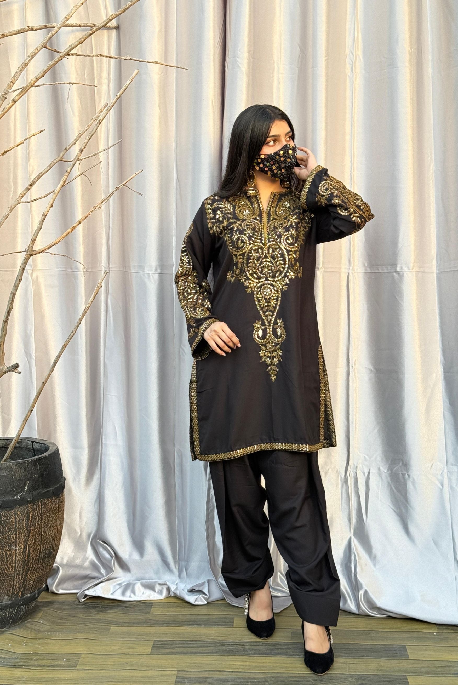 An Embroidered Marina Shirt With Decorous Embroidery On Neckline, Sleeves And Border Which Is Paired Up With Trouser That Is A Perfect Match For Your Wardrobe And Any Occasion